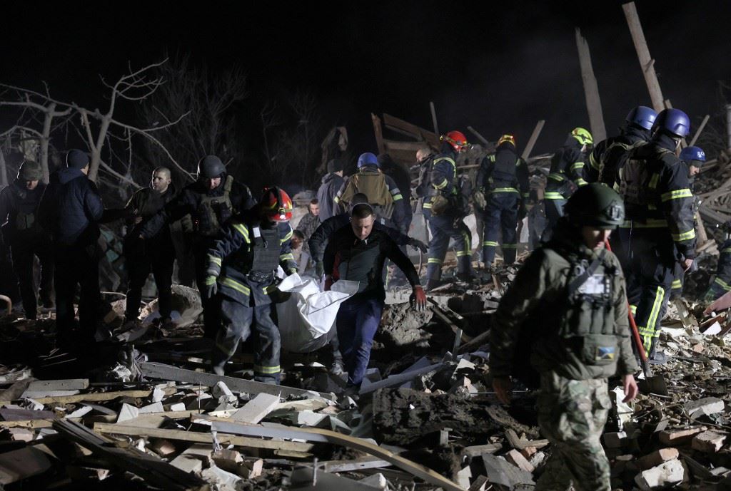 شرطيون وعمال إنقاذ أوكرانيون يحملون جثة أحد السكان المحليين اثر مقتله في هجوم صاروخي روسي في كراماتورسك بمنطقة دونيتسك (17 شباط 2024، أ ف ب).