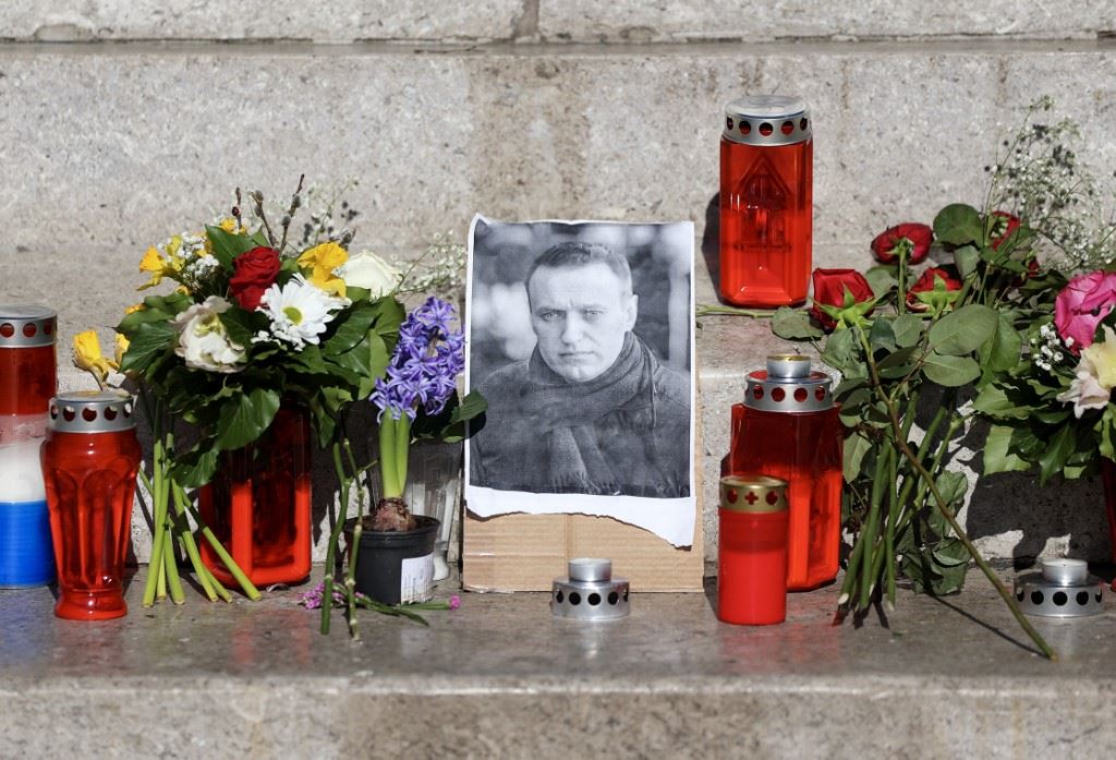 زهور وشموع وضعت عند نصب تذكاري موقت لنافالني في وسط مدينة زغرب (20 شباط 2024، أ ف ب).