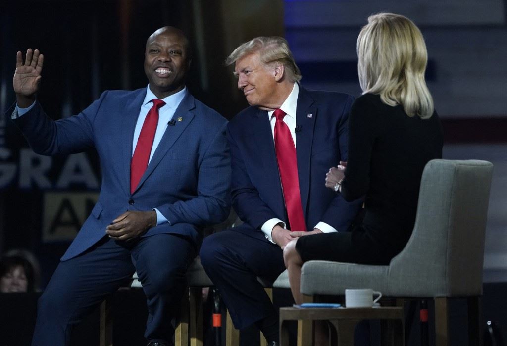 ترامب والسيناتور الجمهوري تيم سكوت يشاركان في حدث "فوكس نيوز تاون هول" مع المضيفة لورا إنغراهام في مركز غرينفيل للمؤتمرات في غرينفيل بساوث كارولينا (20 شباط 2024، أ ف ب).