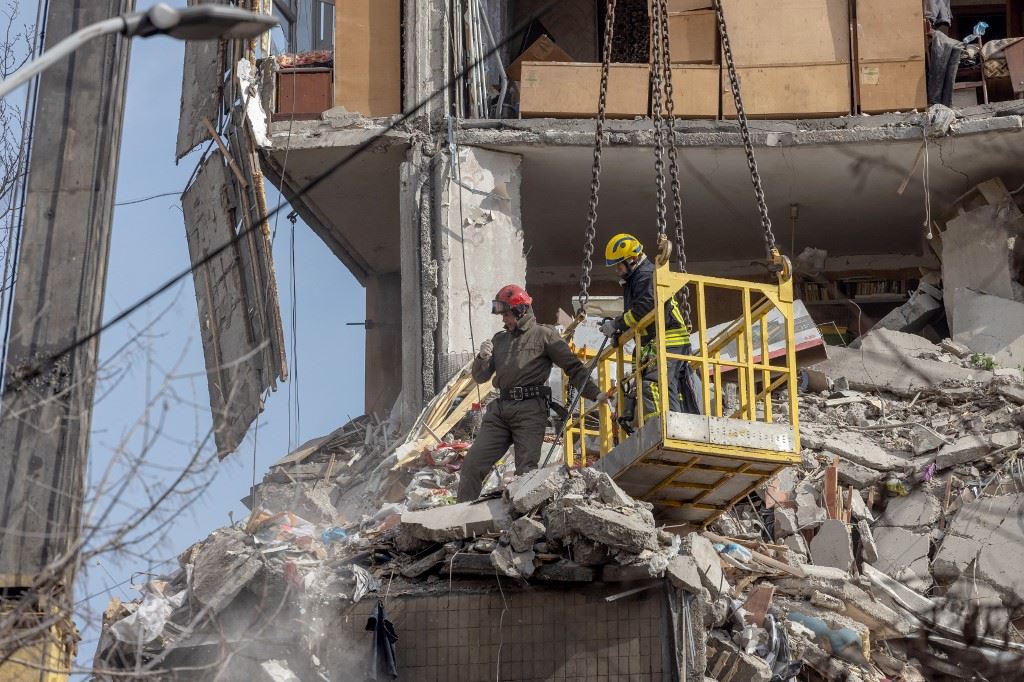 رجال إنقاذ يزيلون الركام في مبنى تعرض لأضرار بالغة بعد غارة بطائرة مسيرة في أوديسا (3 آذار 2024، أ ف ب).