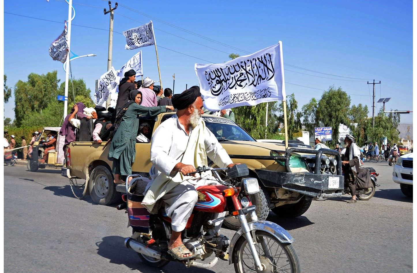 وقال شاه احمد عمري احد مقاتلي "طالبان" لوكالة "فرانس برس": "علم الإسلام يرفرف عالياً. نحن سعداء للعيش تحت راية الإسلام".