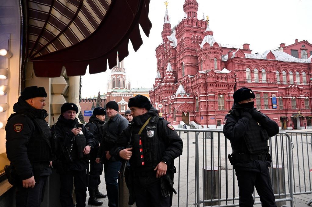 شرطيون واقفوا بجانب الساحة الحمراء المغلقة في وسط موسكو (15 آذار 2024، أ ف ب).