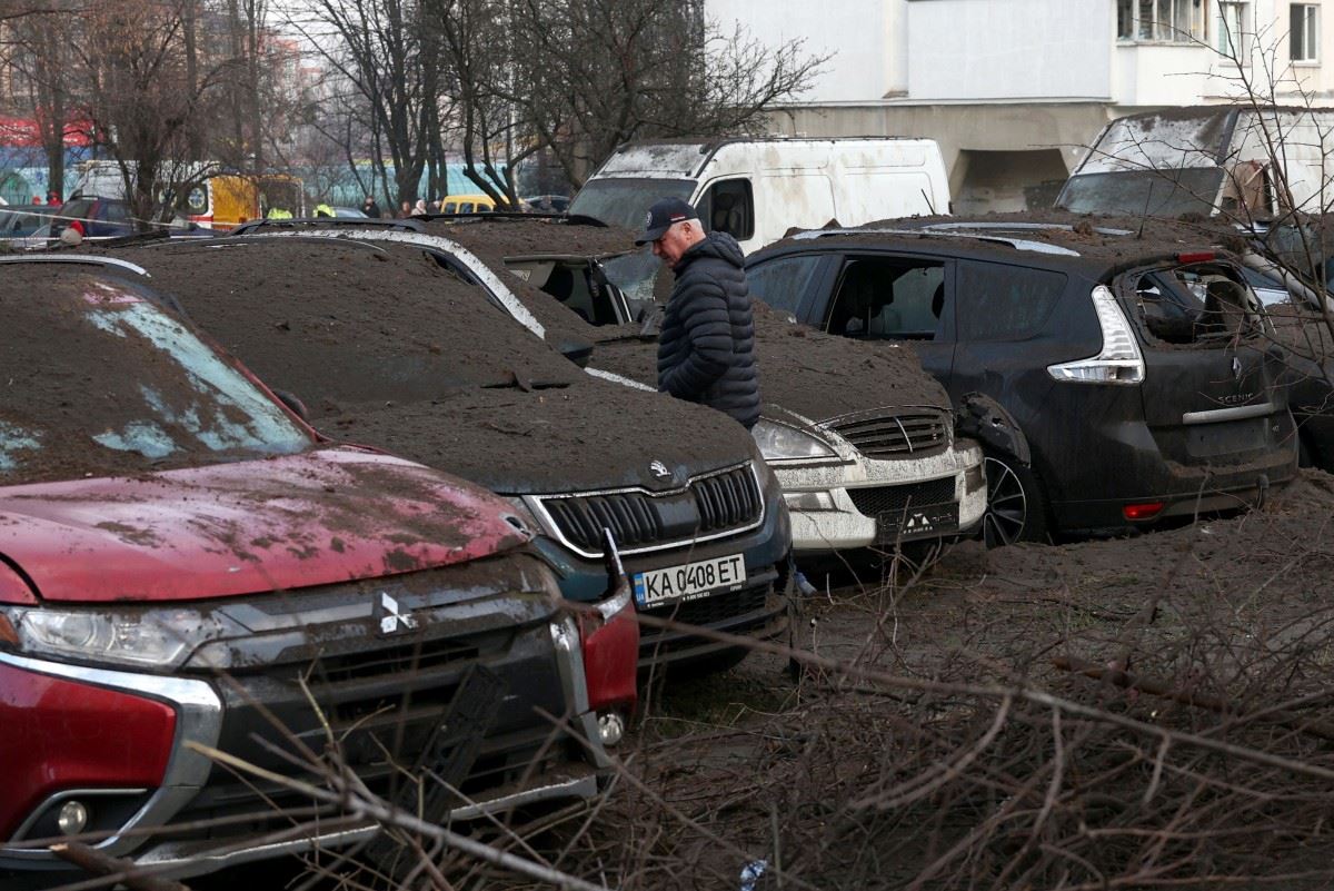 رجل يقف إلى جانب السيّارات المتضررة بعد هجوم صاروخي في كييف (أ ف ب).
