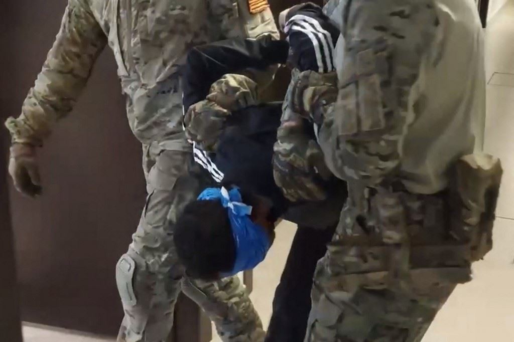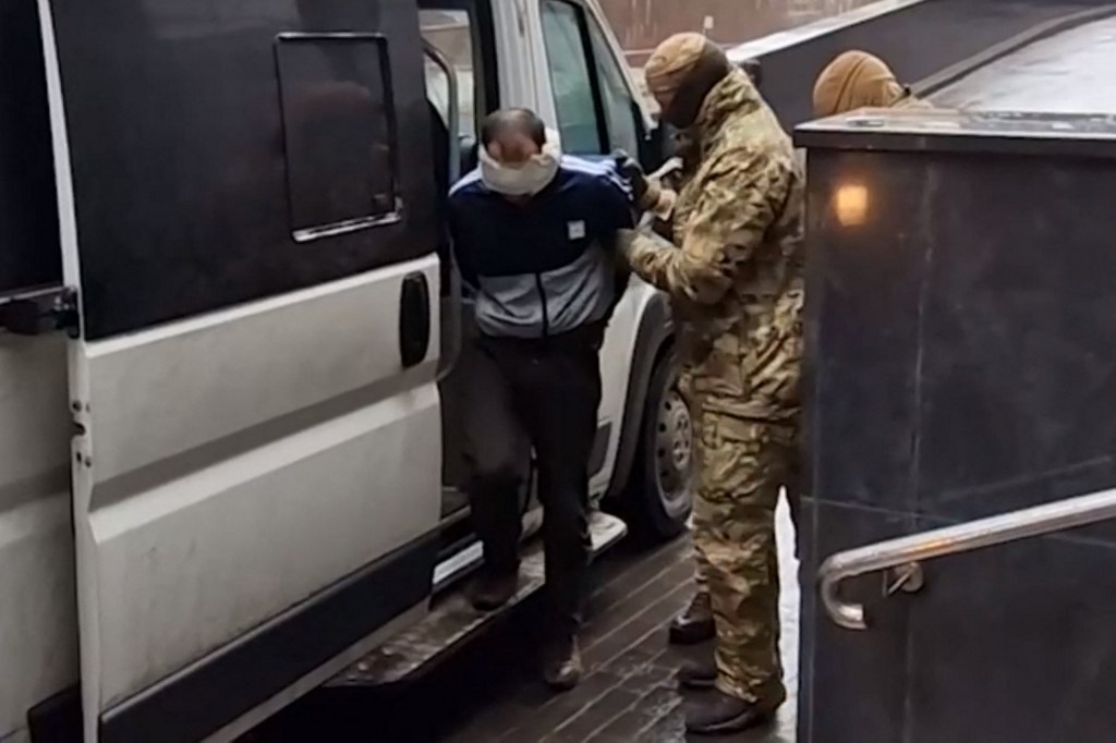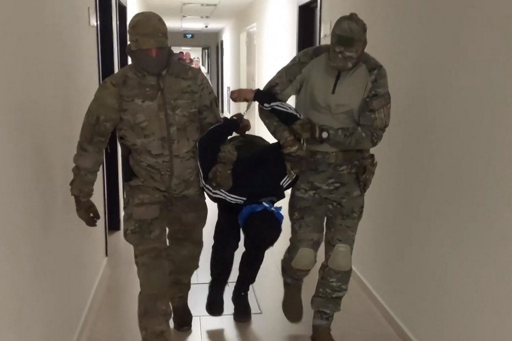 لقطة من فيديو نشرته لجنة التحقيق الروسية في 24 آذار 2024، ويظهر رجال إنفاذ القانون يقتادون أحد الرجال المشتبه فيهم في هجوم قاعة الحفلات قرب موسكو (أ ف ب).
