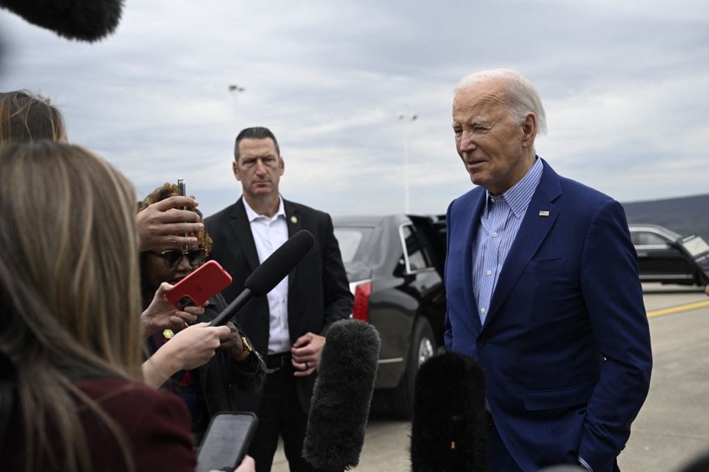 بايدن مصرحا قبل ان يصعد الى الطائرة الرئاسية في مطار ويلكس بار سكرانتون الدولي في أفوكا ببنسلفانيا (17 نيسان 2024ـ أ ف ب).