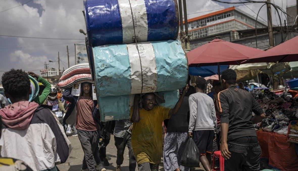 رجل يحمل براميل على رأسه في منطقة ميركاتو التاريخية في أديس أبابا (27 ك2 2024، أ ف ب).