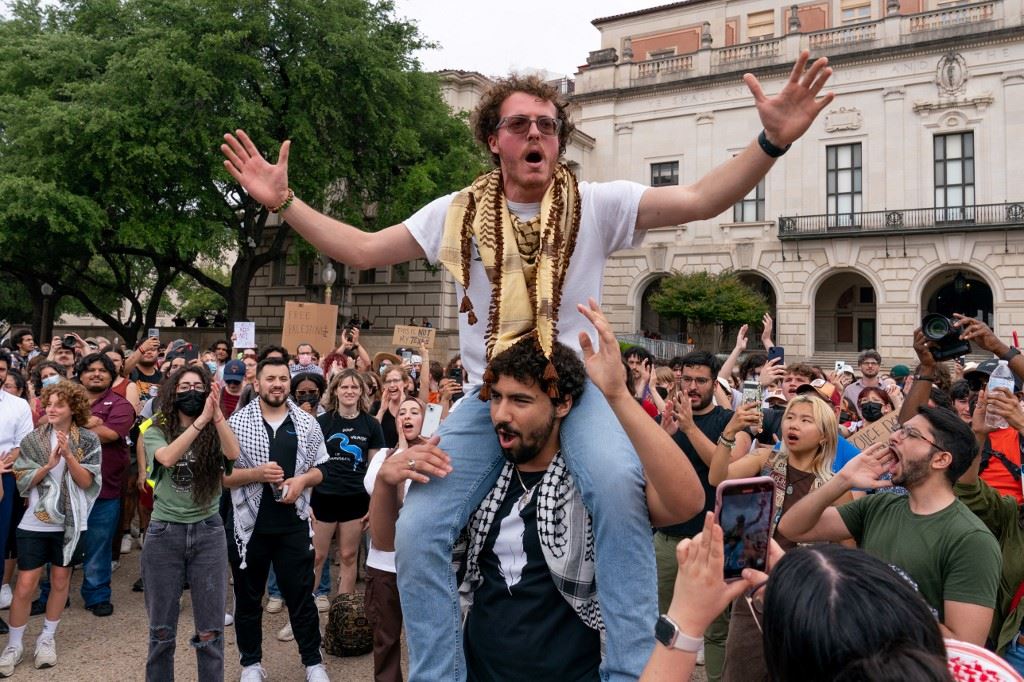 متظاهرون ضد الحرب في غزة تجمعوا لدعم الفلسطينيين في حرم جامعة تكساس في أوستن بتكساس (25 نيسان 2024، أ ف ب).