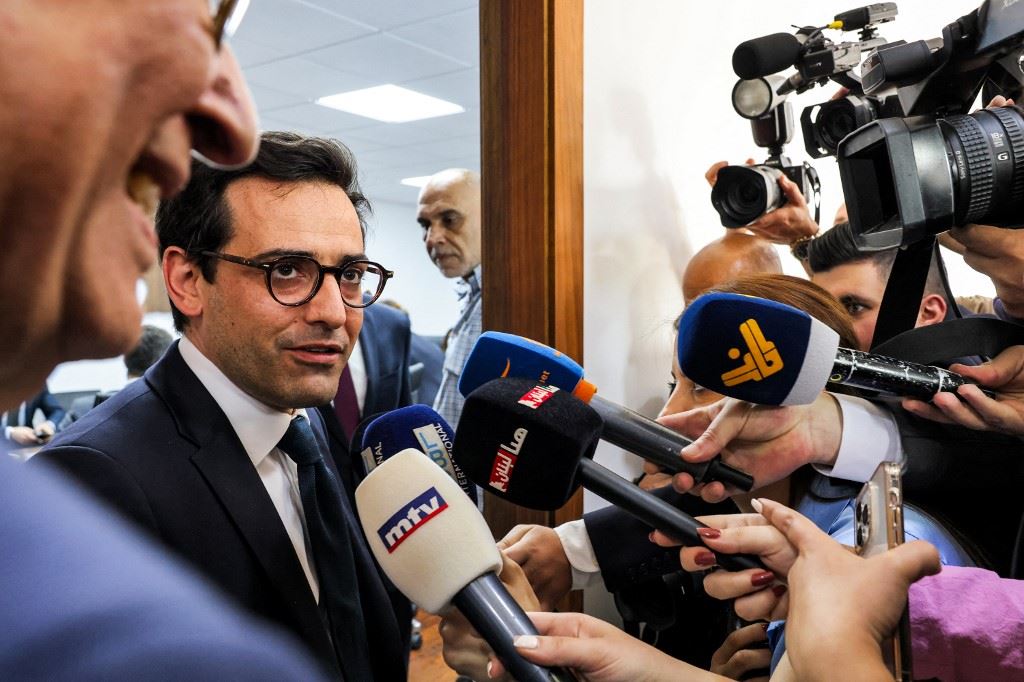 سيجورنيه يجيب على أسئلة الصحافيين بعد اجتماعه بنظيره اللبناني (الى اليسار) في بيروت (28 نيسان 2024، أ ف ب).