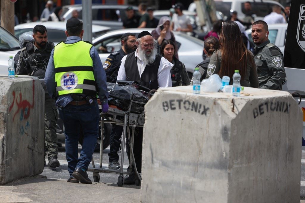 نقل جثة المهاجم على نقالة في أعقاب عملية طعن في البلدة القديمة بالقدس (30 نيسان 2024، أ ف ب).