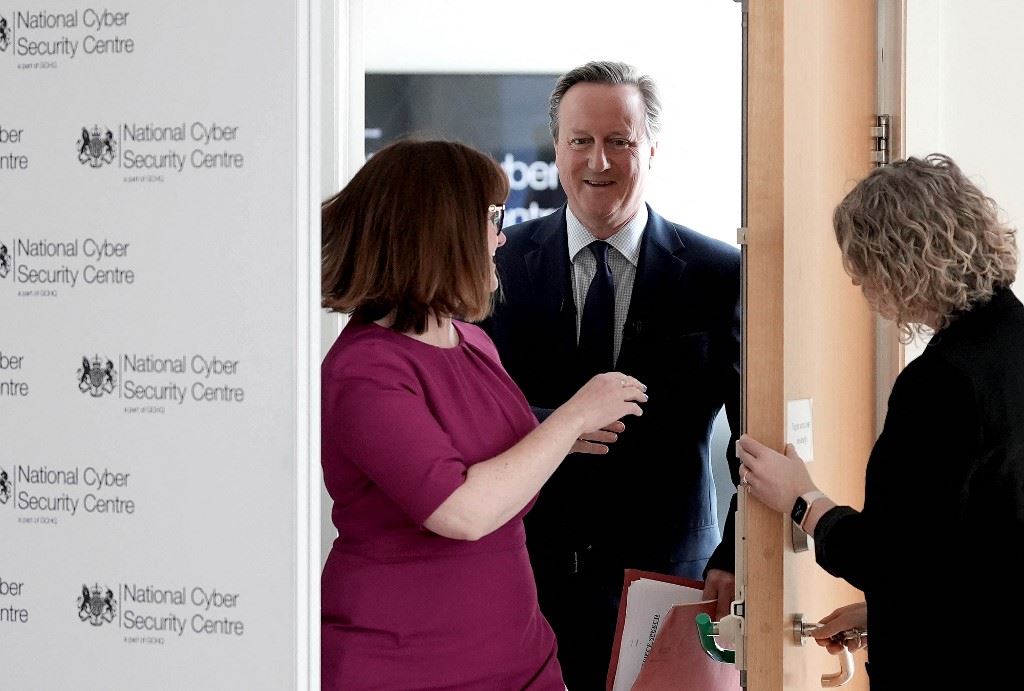 كاميرون لدى وصوله لإلقاء خطاب في المركز الوطني للأمن السيبراني في لندن (9 ايار 2024، أ ف ب).