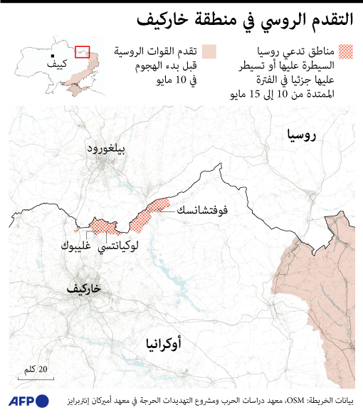 وفي تفاصيل هذا التطوّر الميدانيّ أنه بين التاسع من أيار والخامس عشر منه، سيطرت روسيا على 257 كيلومتراً مربعاً في منطقة خاركيف وحدها في شمال شرق أوكرانيا، وهو مركز الهجوم الروسي الجديد حيث أعلنت موسكو الاستيلاء على بلدات عدّة.