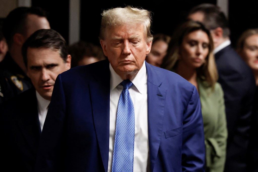 ترامب يصل للتحدث إلى الصحافة، في ختام إجراءات اليوم خلال محاكمته في محكمة مانهاتن بنيويورك (20 ايار 2024، أ ف ب).