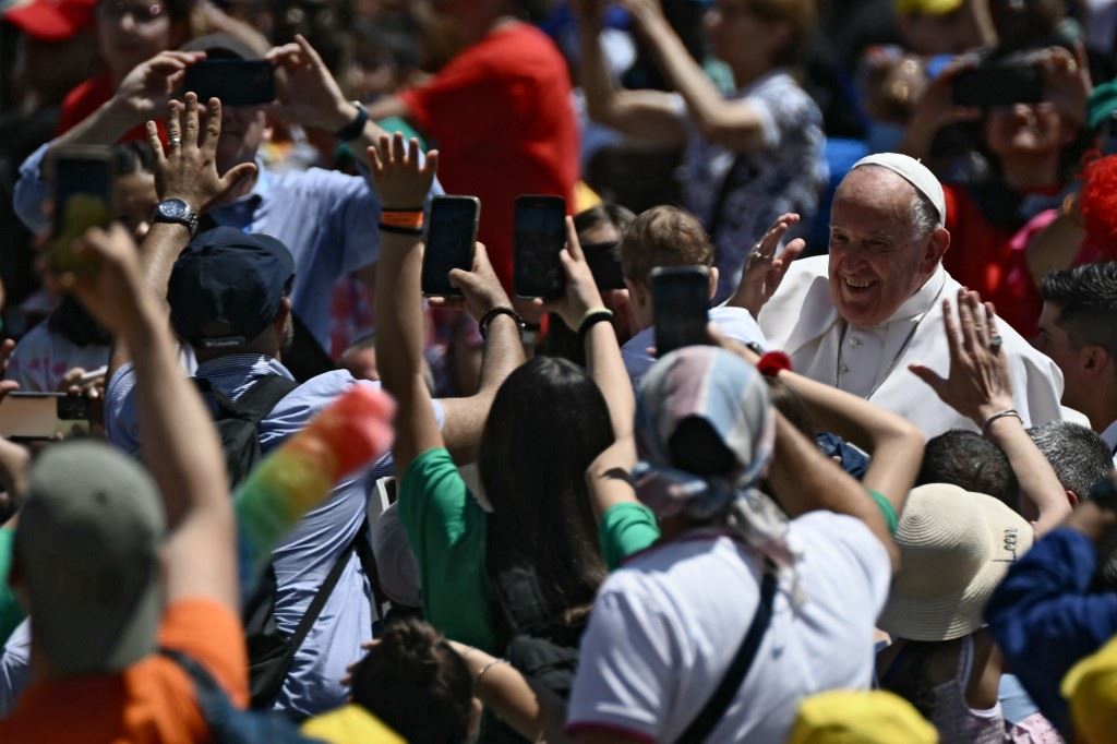 البابا فرنسيس يحيي الحشود خلال مغادرته بعد الاحتفال بقداس في كاتدرائية القديس بطرس بالفاتيكان في اليوم العالمي للطفل (26 ايار 2024، أ ف ب).
