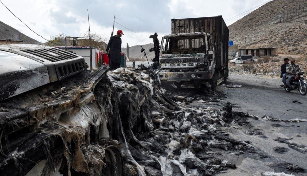 صورة أرشيفية- رجل يقف بالقرب من حاويات شاحنات متفحمة أحرقتها الجماعة الانفصالية المسلحة جيش تحرير بلوشستان في منطقة بولان الوسطى في مقاطعة بلوشستان (30 ك2 2024، أ ف ب).