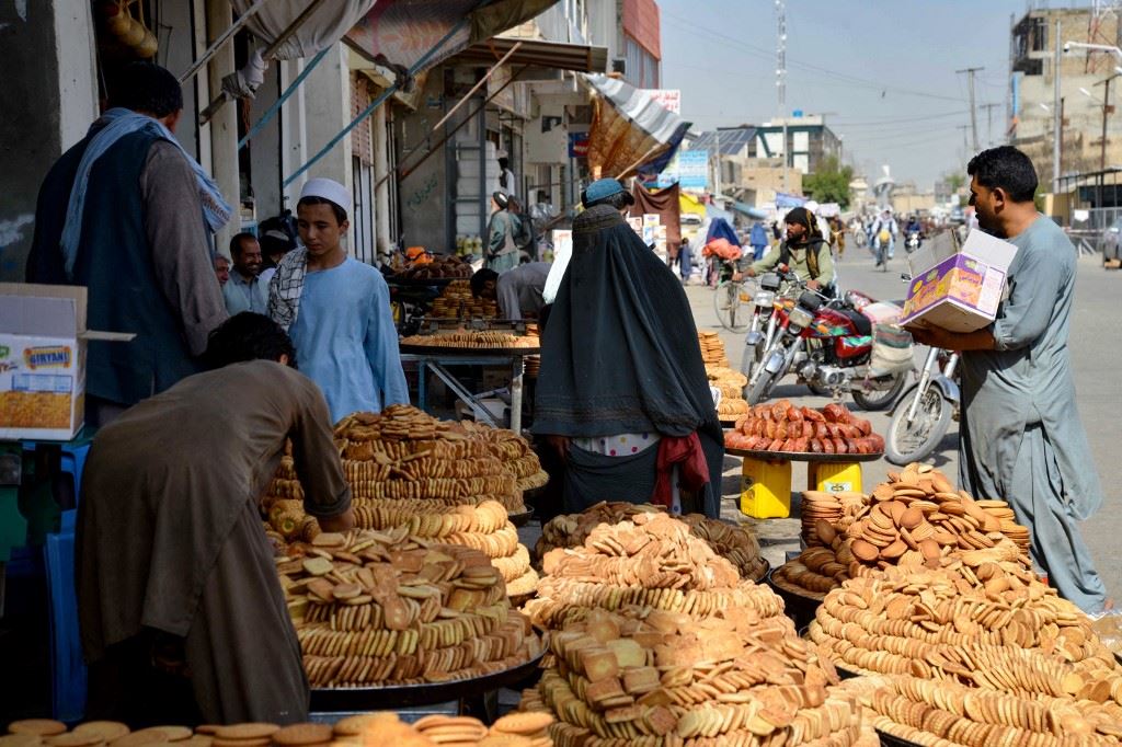 امرأة أفغانية تشتري كعكا محليا يسمى "كولشا" في سوق بقندهار (15 حزيران 2024، أ ف ب).