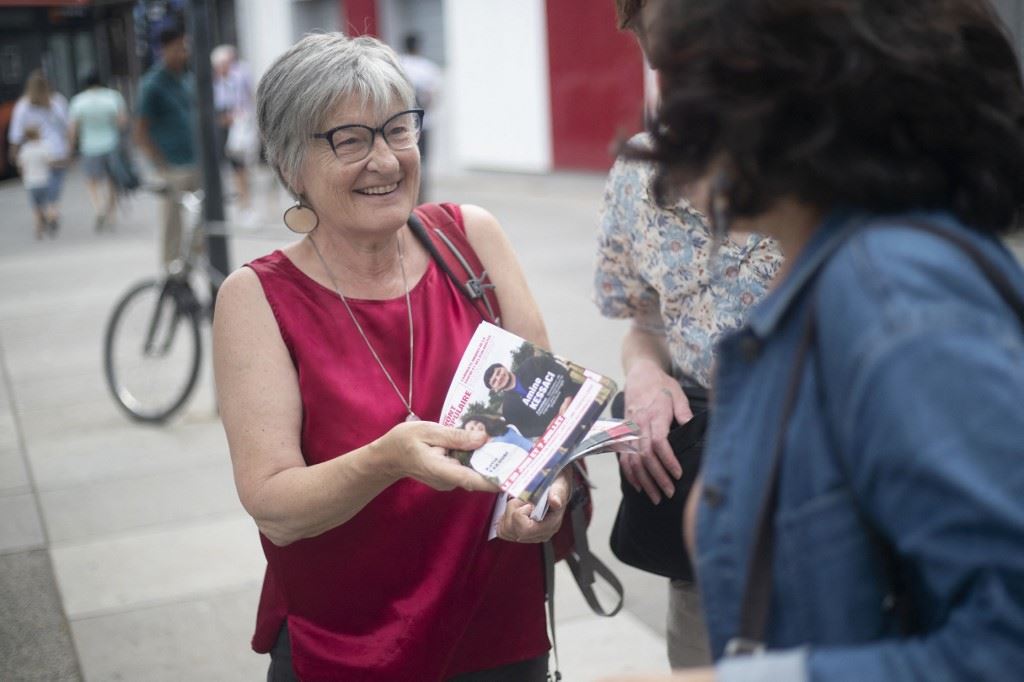 ناشطة من الائتلاف اليساري "الجبهة الشعبية الجديدة" توزع منشورات في مرسيليا جنوب فرنسا (24 حزيران 2024، أ ف ب).