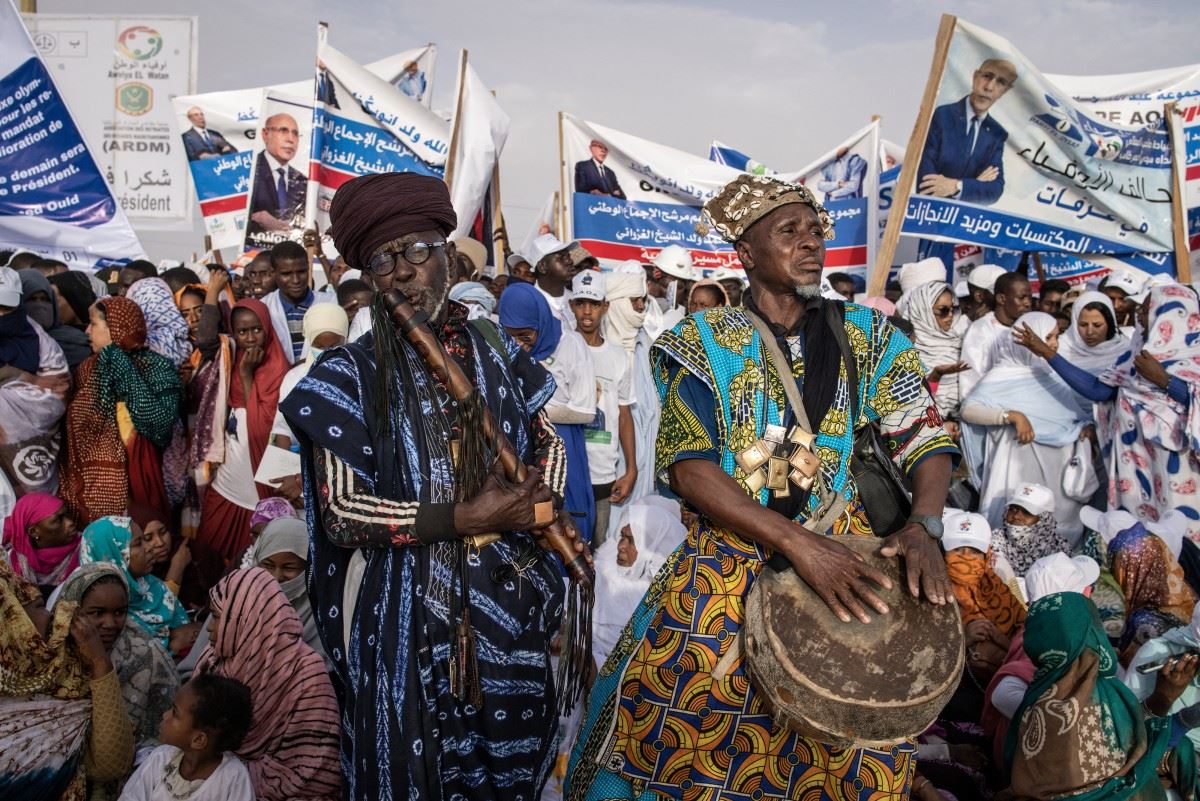 أنصار للرئيس الموريتاني محمد ولد الغزواني يعزفون الموسيقى خلال تجمع انتخابي في نواكشوط (27 حزيران 2024، أ ف ب).