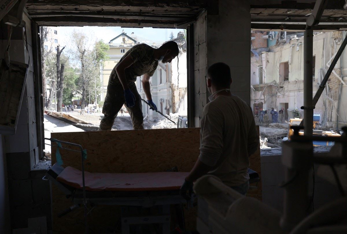 صورة ارشيفية- جنود ومتطوعون أوكرانيون يغطون نوافذ محطمة بألواح من الخشب في غرفة عمليات بمستشفى أوخماتديت للأطفال بعد يوم من هجوم صاروخي على كييف (9 تموز 2024، أ ف ب).