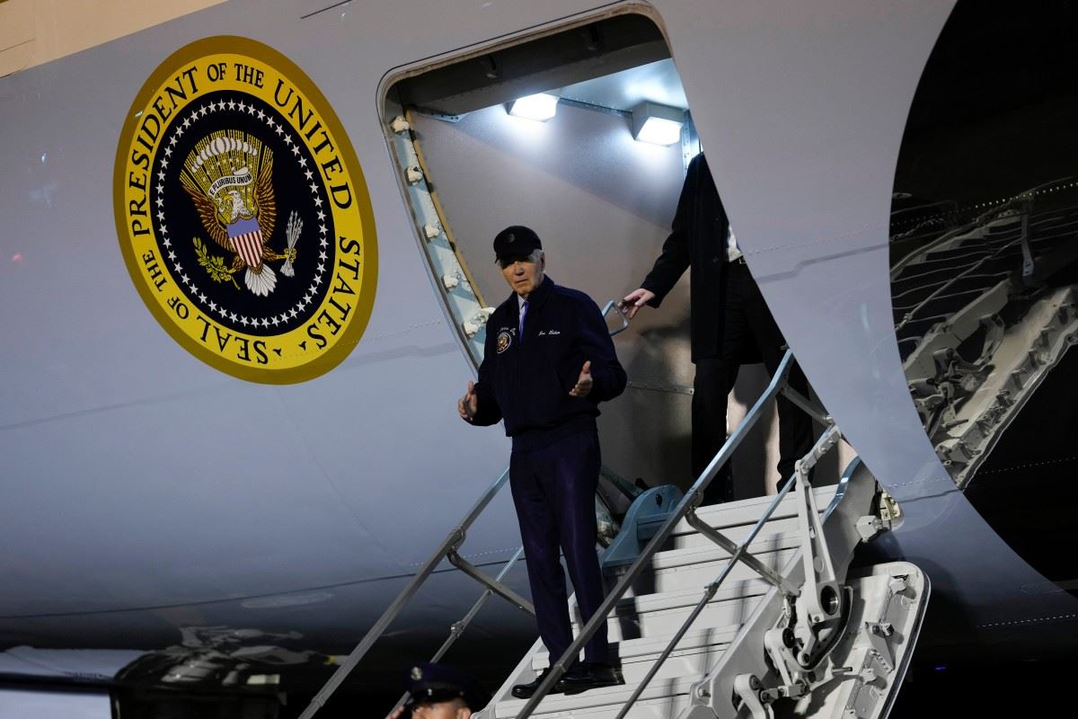 بايدن ينزل من الطائرة الرئاسية لدى وصوله إلى قاعدة دوفر الجوية في دوفر بولاية ديلاوير (17 تموز 2024، أ ف ب).