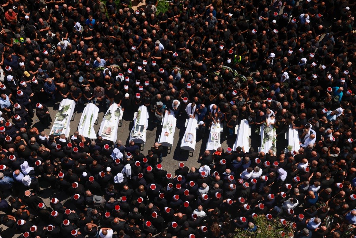 شيوخ ومشيّعون من الدروز يحيطون بتوابيت 10 من بين 12 شخصاً قتلوا في هجوم صاروخي في بلدة مجدل شمس الدرزية في مرتفعات الجولان التي ضمتها إسرائيل (28 تموز، 2024 - أ ف ب).