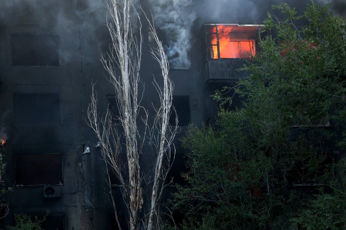مبنى سكني يحترق بعد قصف في مدينة توريتسك بمنطقة دونيتسك (29 تموز 2024، أ ف ب).