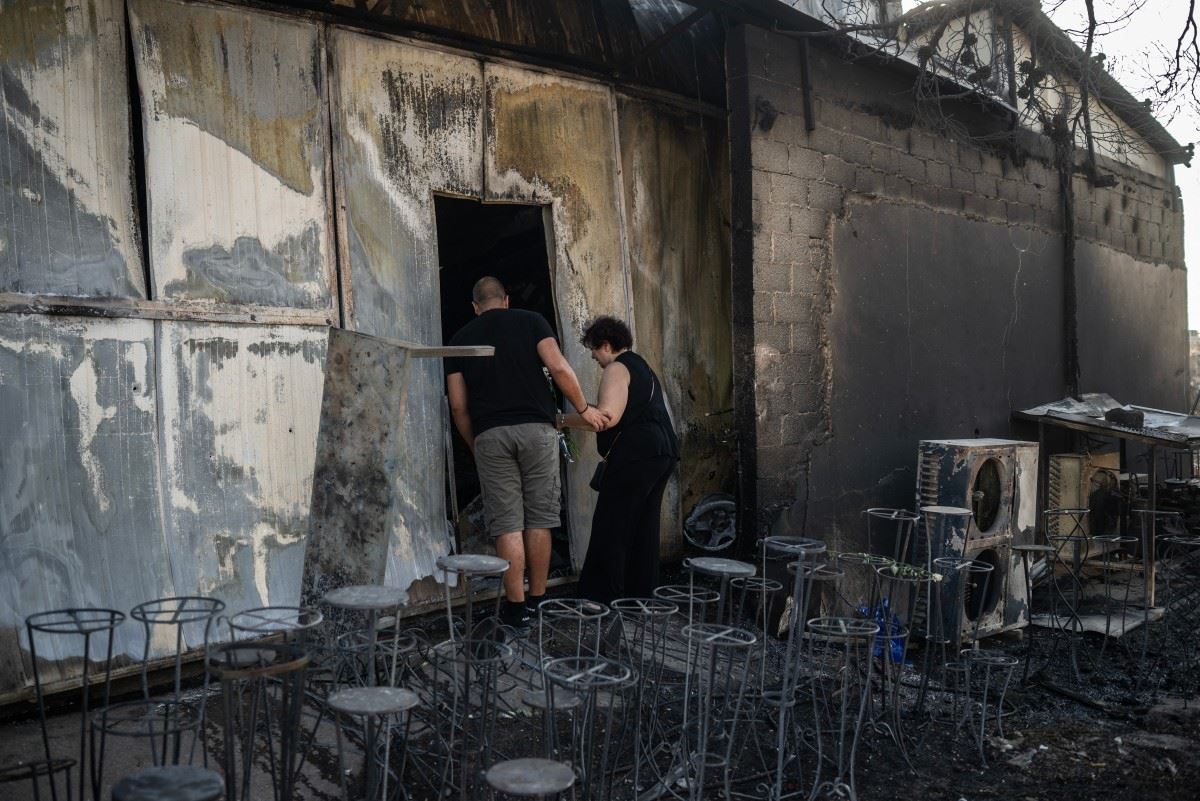 سكان محليون يتفقدون مصنعا محترقا من جراء حريق غابات في خالاندرى بالضواحي الشمالية الشرقية لأثينا (14 آب 2024، أ ف ب).