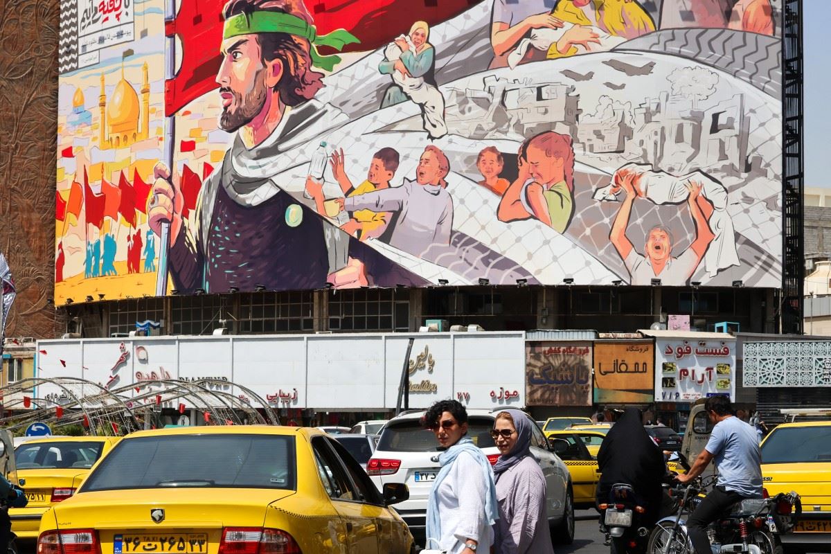 سيارات تعبر قرب لوحة إعلانية مناهضة لإسرائيل في طهران (20 آب 2024، أ ف ب).