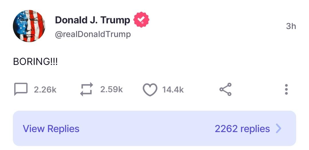 وكتب المرشح الجمهوري على منصته "تروث سوشيال" اليوم الجمعة: "مملة!"، في حين سخرت منها حملته، خصوصاً أن اللقاء على شبكة "سي إن إن" كان قصيراً جداً ولم يدم سوى 27 دقيقة.