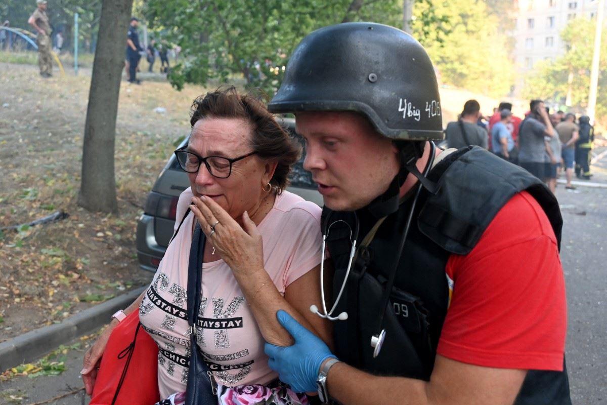 مسعف أوكراني يساعد امرأة في موقع هجوم صاروخي في خاركيف (15 ايلول 2024، أ ف ب).