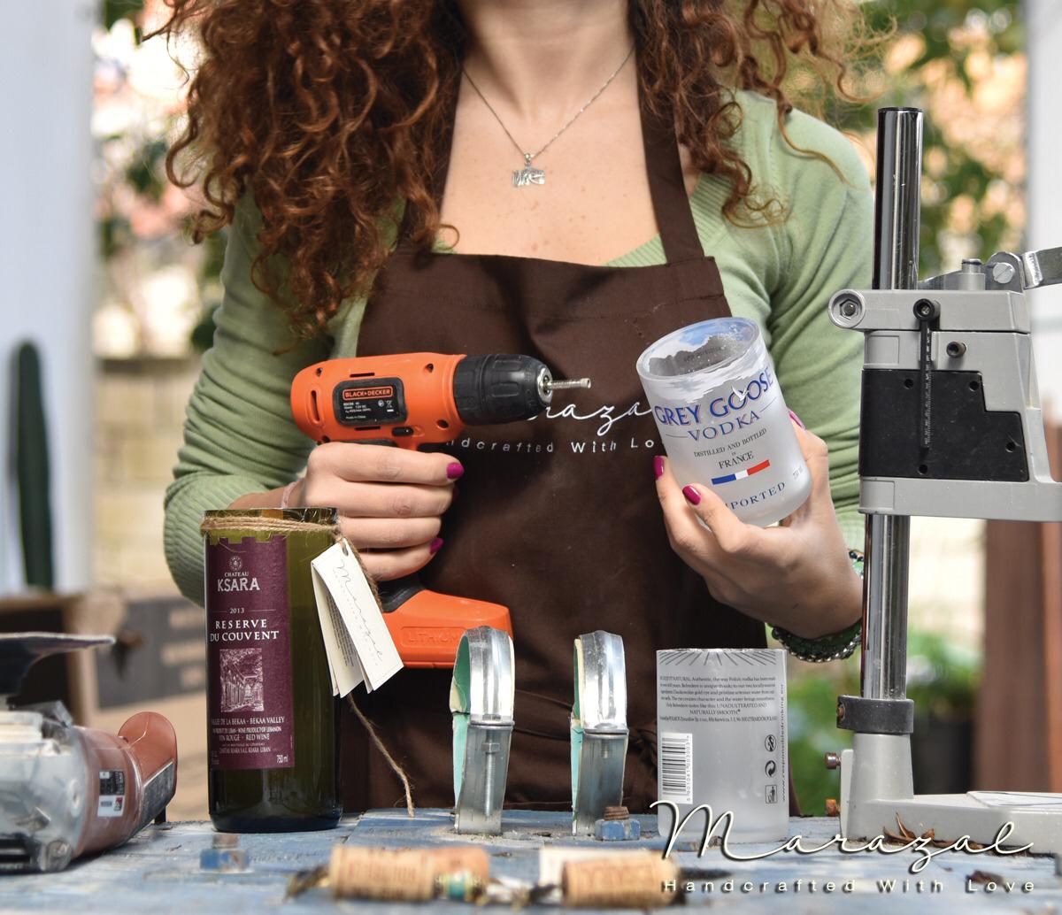 تصاميمها هي يدوية 100%، ولا تستعين بأي شخص آخر. حتى قطع الخشب المصاحِبة للزجاجات، تقوم مريم بتشكيلها وطليها على مزاجها. وكذلك الشمع، فمريم تذيبه وتشكّله، وتمدّد الإضاءة داخل التصاميم وتركّبها.