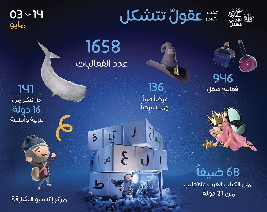 تحت شعار "عقول تتشكل"، تنظّم "هيئة الشارقة للكتاب" مهرجان "الشارقة القرائي للطفل" بدورته الـ 14. ويستقبل المهرجان الزوّار على مدار 12 يوماً في "مركز إكسبو الشارقة"، ضمن 1658 فعالية ثقافية وإبداعية وفنية متنوعة يقدّمها 512 ضيفاً (كاتباً وفناناً ومسرحياً) من 66 دولة، بحضور ومشاركة 141 دار نشر، منها 93 دار نشر عربية و48 دار نشر أجنبية، تتصدّرها الإمارات بـ 77 ناشراً، وتليها لبنان بـ 12 ناشراً، وتليها دولاً أخرى.