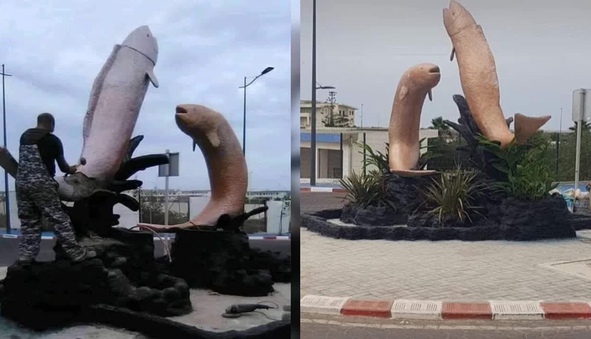 ويقع التمثال، الذي يظهر سمكتين بلون الخوخ تقفزان في الهواء، على دوار في مدينة المهدية الساحلية.