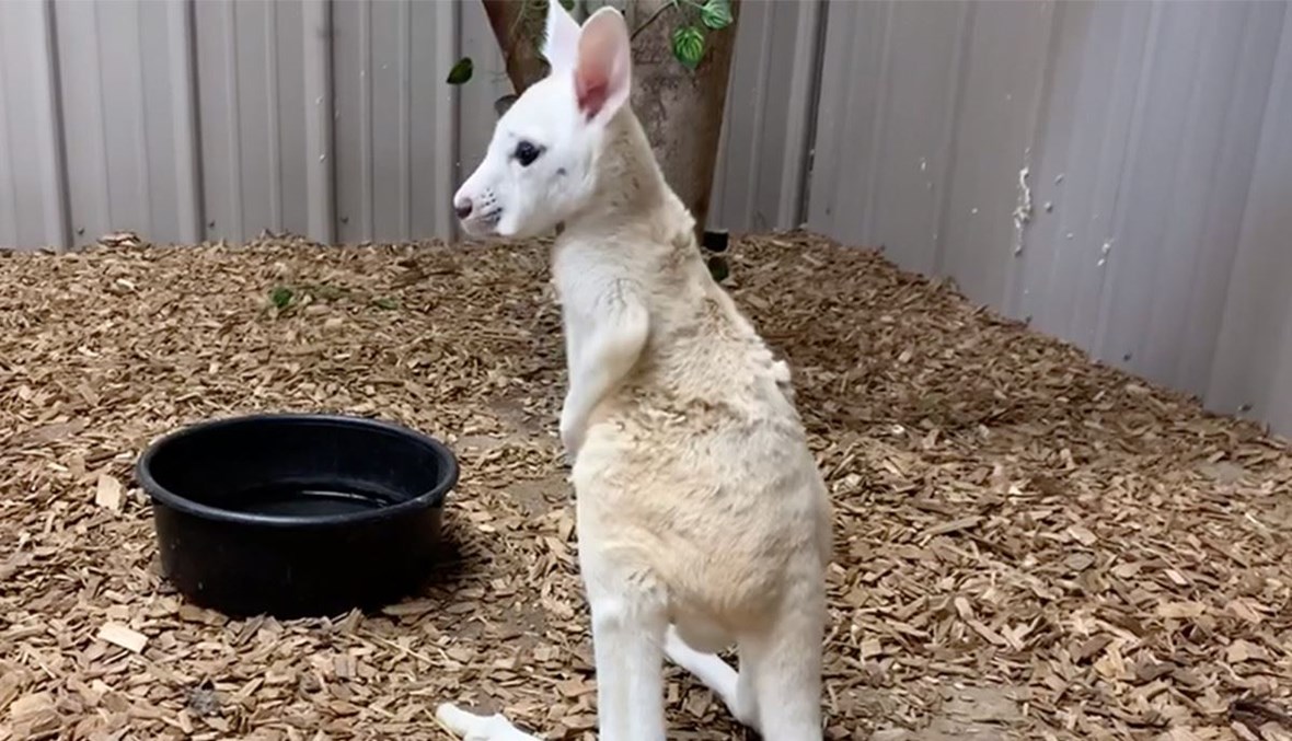 وفي التفاصيل، وُلد الكنغر الصغير بفروٍ أبيض وعينين سوداوين في حديقة الحيوانات في هاربورسفيل منذ خمسة أشهر لذكر كنغر أحمر يُدعى "بومر" وكنغر أنثى تُدعى "روزي".