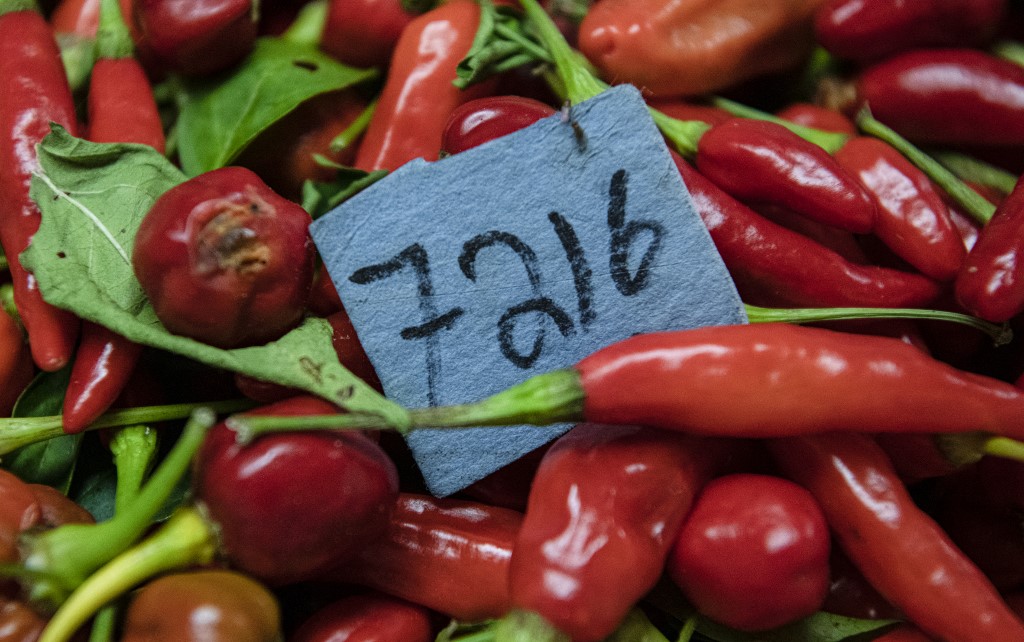 عالمان من المركز الاستكشافي للبحوث الزراعية والتعليم العالي في المناطق الاستوائية يجمعان فلفل الهالابينيو لاستخراج بذوره وتخزينها في بنك البذور في توريالبا، كوستاريكا (19 تموز 2023 - أ ف ب).