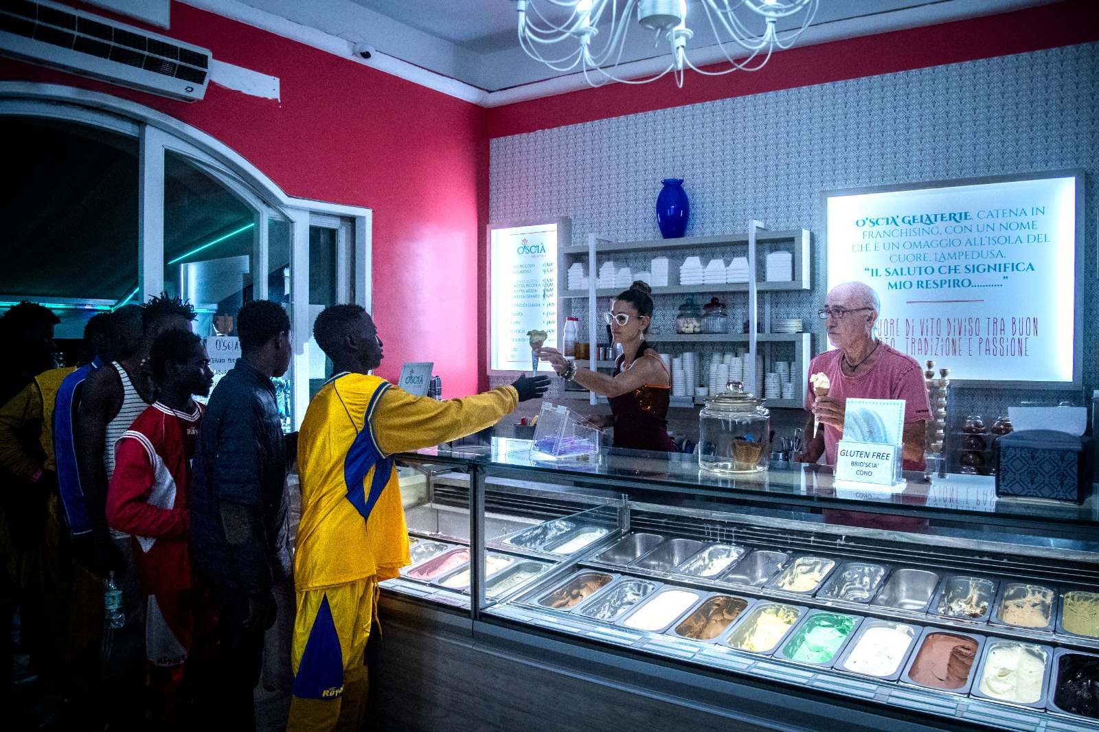 كافحت جزيرة لامبيدوزا الإيطالية الصغيرة للتعامل مع زيادة في قوارب المهاجرين من شمال إفريقيا بعد أن بلغت الأعداد ذروتها عند 7000 شخص. وفي وقت لاحق، غادر بعض الشباب المركز المكتظ وتوجهوا إلى وسط مدينة لامبيدوسا التاريخي، حيث وجد مصور "أ ف ب" بعضهم يشترون الآيس كريم في متجر للجيلاتيريا. وقال العديد منهم إنهم كانوا جائعين. القليل منهم كان لديهم أموال، وبعض المطاعم رفضتهم. لكن مؤسسات أخرى قدمت الطعام مجاناً، أو دفع ثمنه المقيمون والسياح.