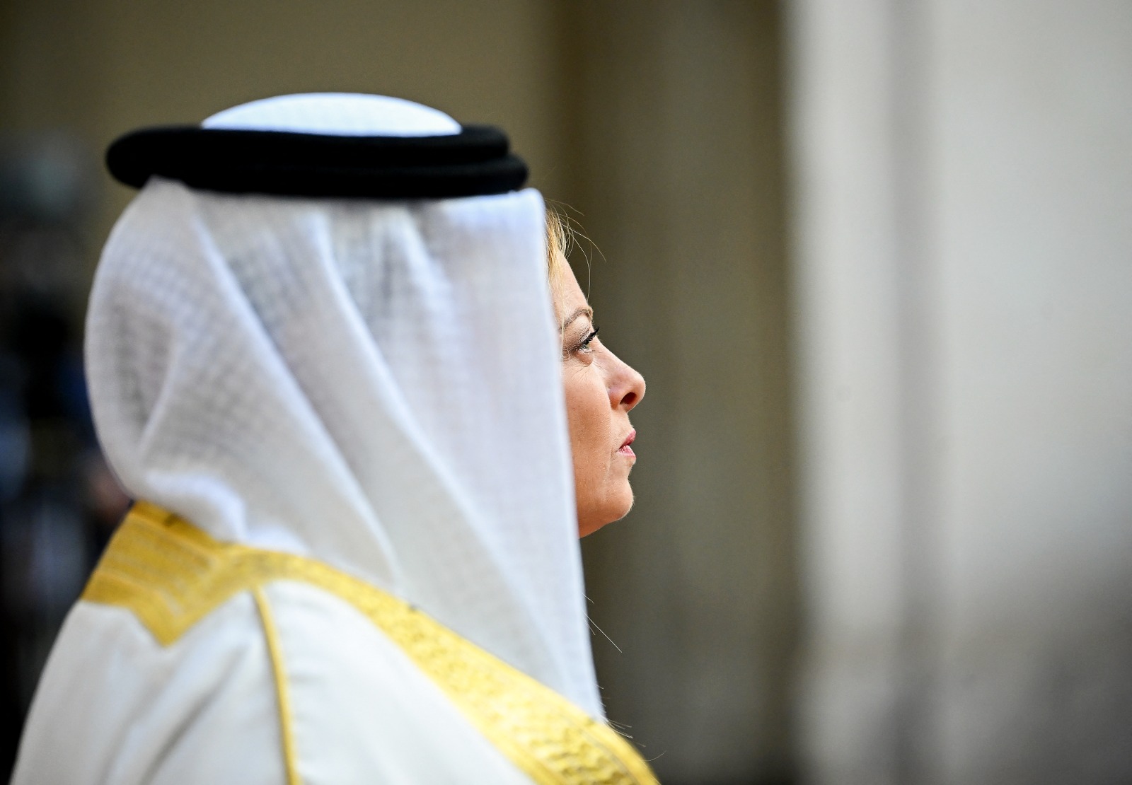 25-رئيسة الوزراء الإيطالية جيورجيا ميلوني (على اليمين) تقف مع ملك البحرين حمد بن عيسى آل خليفة (يسار) أثناء لقائهما في روما بالازو تشيغي في 17 تشرين الأول 2023. (تصوير فيليبو مونتيفورتي / أ ف ب).
