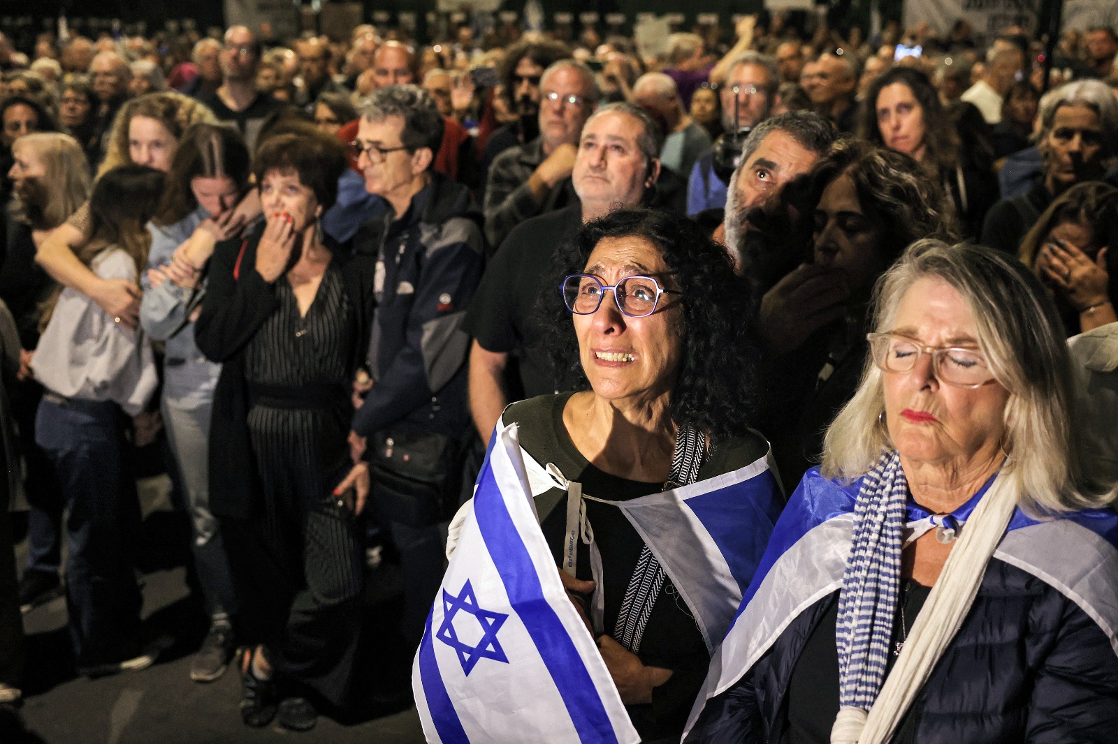 26-رد فعل امرأة أثناء حضورها مظاهرة تطالب رئيس الوزراء الإسرائيلي بالاستقالة ووقفة احتجاجية تطالب باتخاذ إجراءات حكومية لإعادة الرهائن في 7 تشرين الثاني 2023. (تصوير أحمد الغربلي / أ ف ب).