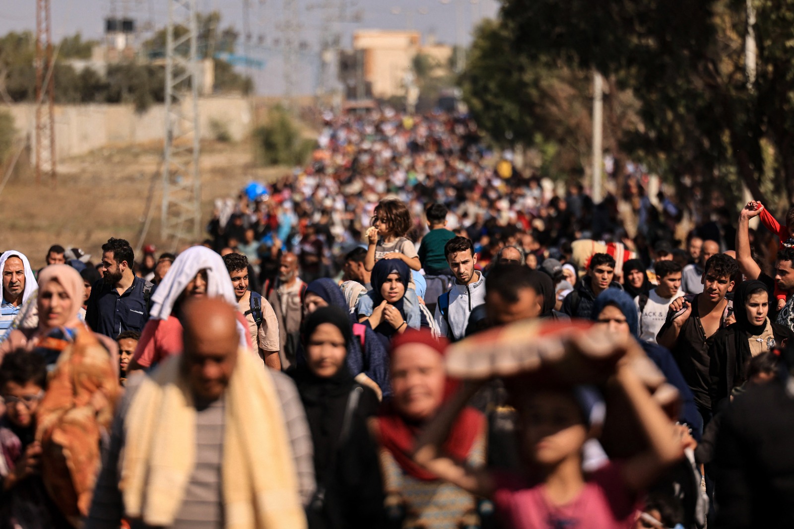 28-عائلات فلسطينية تفر من مدينة غزة وأجزاء أخرى من شمال غزة باتجاه المناطق الجنوبية، تسير على طول طريق في 10 تشرين الثاني 2023. (تصوير محمود همس / أ ف ب).