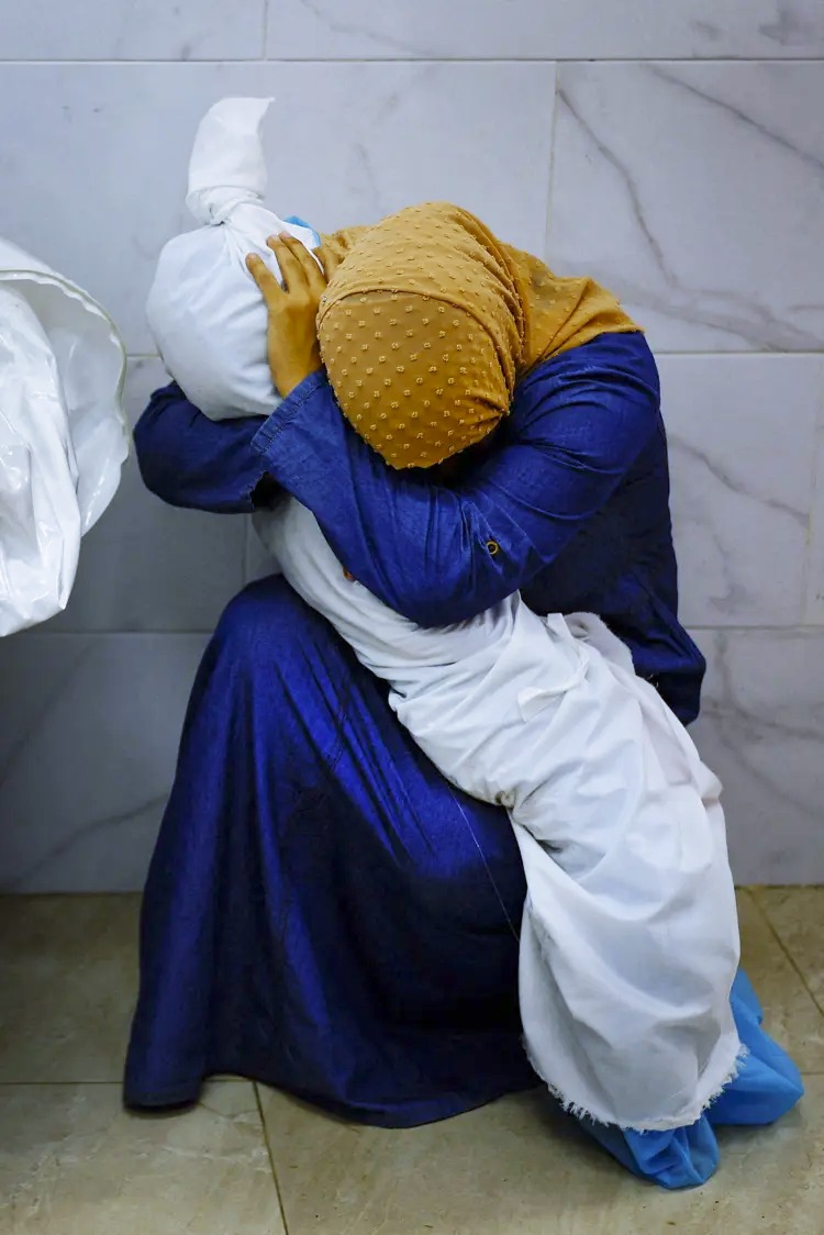 2- إيناس أبو معمر، امرأة فلسطينية تحتضن جثمان ابنة أختها سالي البالغة من العمر 5 سنوات، في مستشفى ناصر في خان يونس بجنوب قطاع غزة، 17 تشرين الأول. (محمد سالم/ رويترز)