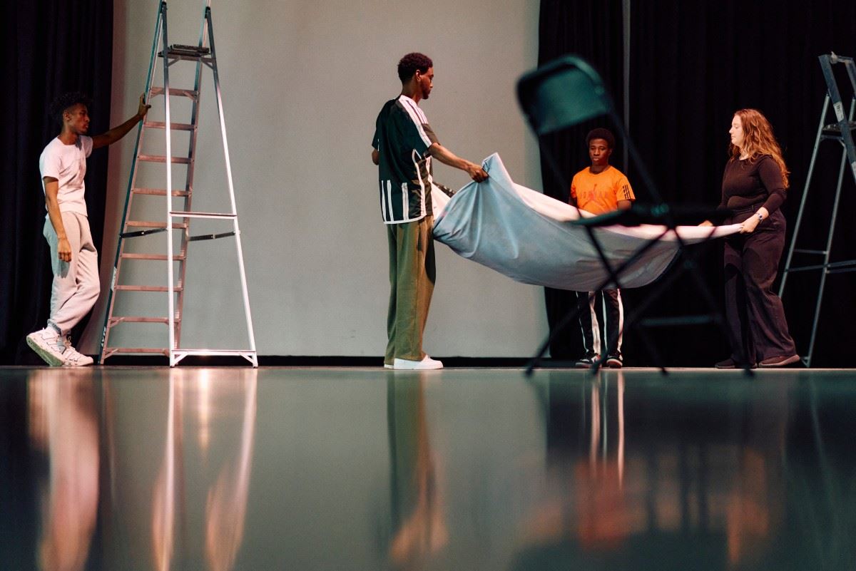 أبيل (الى اليسار)، إسماعيل محمد (في الوسط)، وإبراهيم شيبو (الثاني من اليمين) وكليفينا موريكي، أعضاء "فوسفوروس ثياتر"، يشاركون في بروفة لمسرحية "تندر" في مركز ريتش ميكس للفنون في لندن (12 نيسان 2024، أ ف ب).