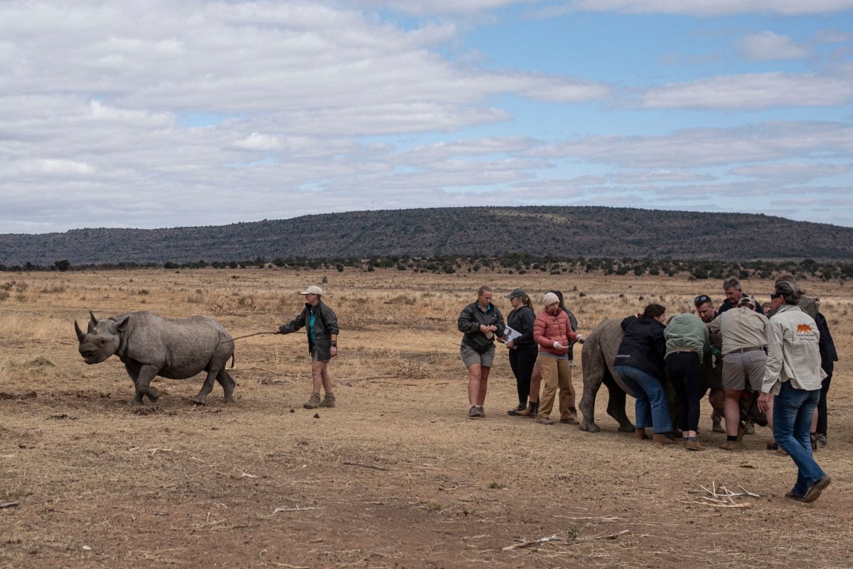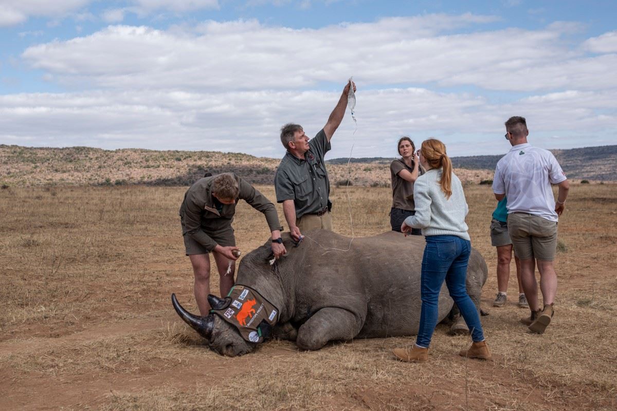 وتتجوّل حيوانات نو وخنازير ثؤلولية وزرافات في المنطقة المحمية الشاسعة فيما يجري الفريق عملية بشكل دقيق على وحيد قرن آخر.