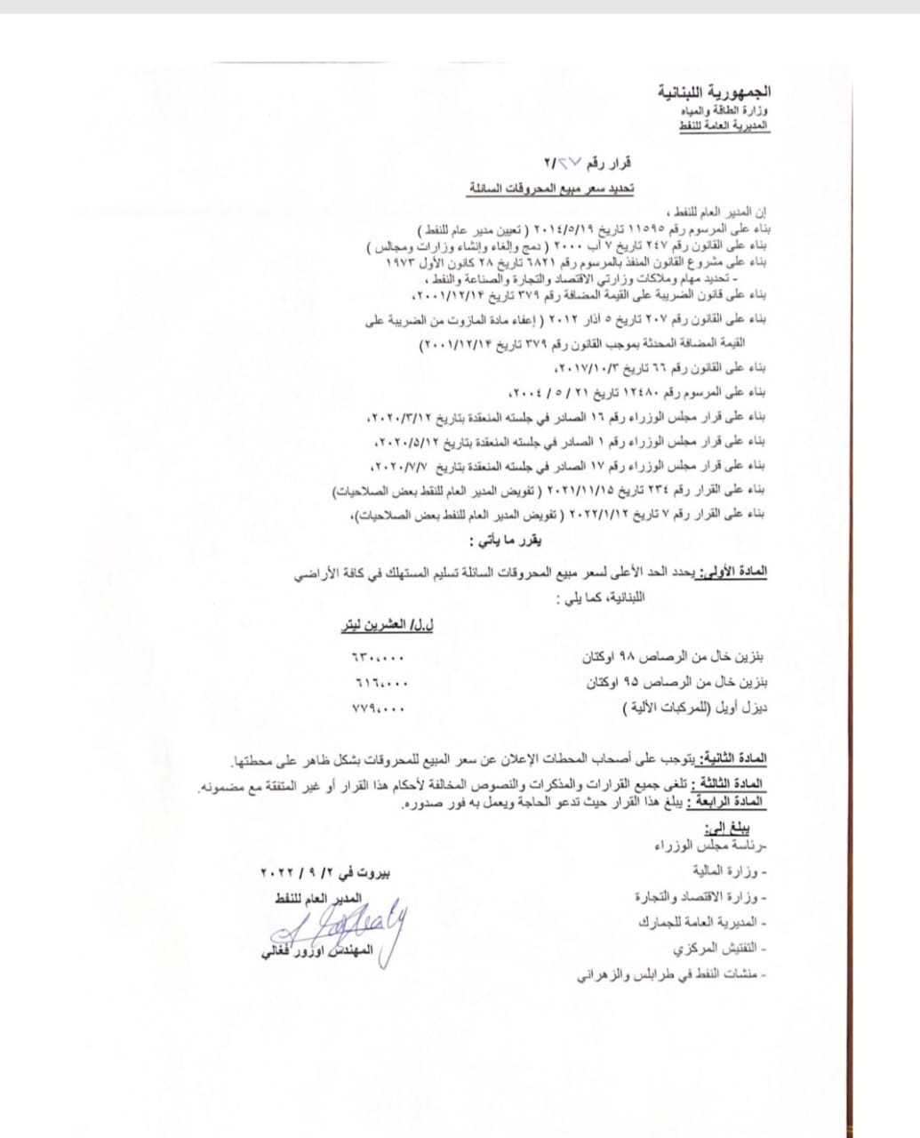 - البنزين 95 أوكتان 616 ألف ليرة.