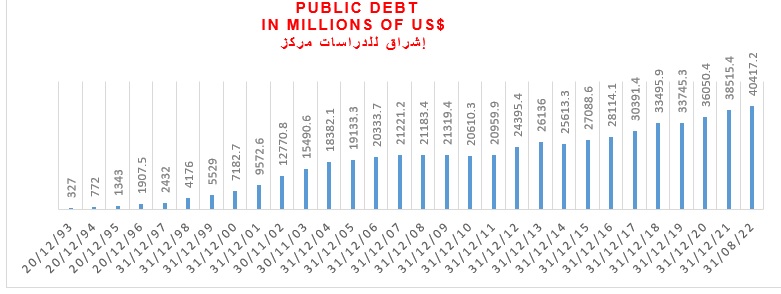 وفق دراسة أعدها مركز إشراق للدراسات، يتبين أن الدين العام بالدولار بلغ في نهاية عام 1993 نحو 327 مليون دولار وصولاً إلى 40.417 مليار دولار في نهاية آب 2022، أي زاد أكثر من 123 ضعفاً. وقد ازداد الدين بالدولار خلال 30 عاماً بمنحنى تصاعدي متزايد، يُظهر مدى الخلل البنيوي في المالية العامة التي عاشت على الاقتراض والاستدانة. وقد ازداد الدين إلى 772 مليون دولار في نهاية عام 1994 أي أكثر من الضعف في سنة واحدة، حتى وصل إلى 5.529 مليارات مع نهاية عام 1999. وإن كان من الممكن تفهّم ازدياد الدين الكبير في بداية التسعينيات لمتطلّبات الإعمار ومسح آثار الحرب الأهلية المدمّرة مما استدعى هذا الاقتراض المتزايد، غير أنه لا يمكن تفسير هذا الاطّراد في الاستدانة بعد تلك المرحلة سوى ضمن العقلية المالية التي أدارت تلك الحقبة القائمة. وقد تراجع هذا الدين بين عامي 2007-2008 من 21.221 مليار دولار إلى 21.183 مليار، وكذلك بين عامي 2009-2010 من 21.319 مليار إلى 20.610 مليار والسبب في ذلك هو المساعدات القطرية إلى لبنان عقب عدوان تموز 2006، وعقب اتفاق الدوحة 2009. وقد ازداد الدين العام ازدياداً ملحوظاً في عام 2012 – عام اللجوء السوري – ليبلغ 24.395 ملياراً عن عام 2011 بقيمة 20.959 ملياراً بزيادة 3.436 مليارات وهي الزيادة الأكبر في تاريخ الدين بالدولار. ومع التوقف عن سداد اليوروبوندز في آذار 2020 ازداد من 36.050 مليار في 2020 إلى 38.515 ملياراً في 2021 ليصل إلى 40.417 ملياراً في نهاية آب 2022.
