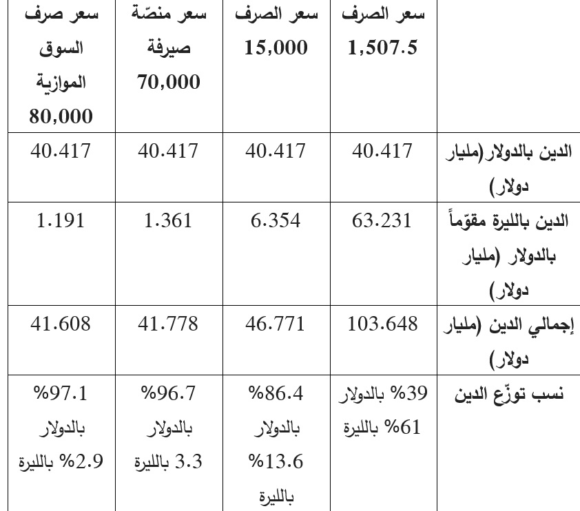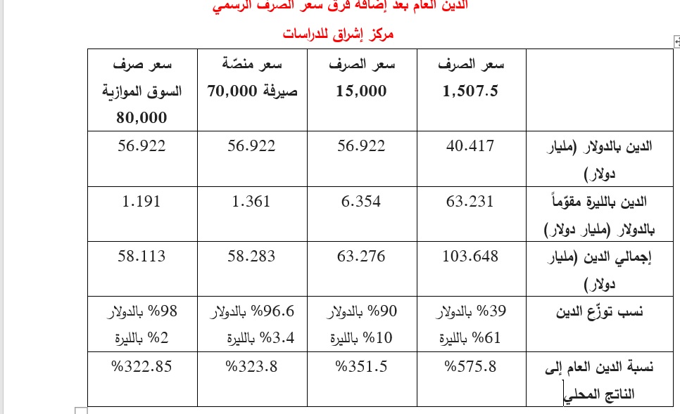 - وفق سعر صرف السوق الموازية 80,000: يبلغ إجمالي الدين العام = 40.417+ 1.191 ( الدين بالليرة) = 41.608 مليار، بحيث يشكّل الدين بالدولار 97.1% منه وبالليرة 2.9%.