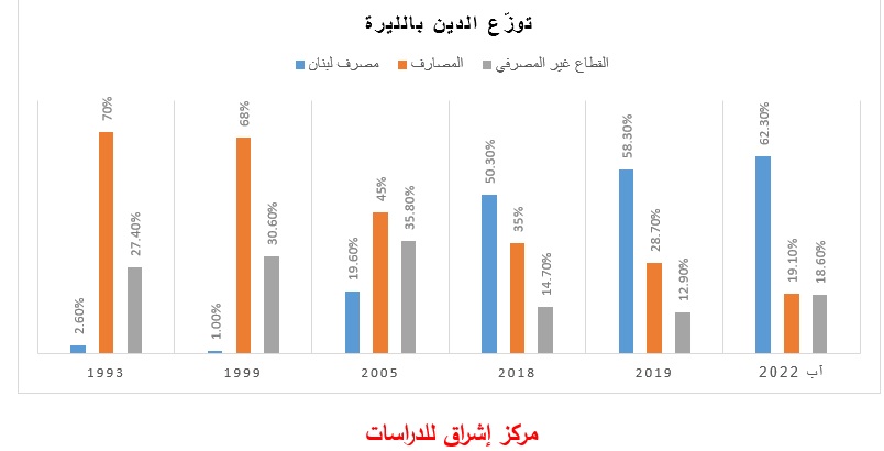 في عام 1993 كانت المصارف تمتلك الحصة الاكبر من الدين بالليرة بنسبة 70% يليها القطاع غير المصرفي بنسبة 27.4%، وكانت حصة مصرف لبنان 2.6% فحسب. ولكن حصل تغيّر جذري في بنية هذا الدين إذ استطاعت المصارف خفض حصّتها من الدين. قبل بدء الأزمة، في عام 2018 بلغت حصة المصارف من الدين بالليرة 35%، حصة مصرف لبنان 50.3% وحصة القطاع غير المصرفي ومن ضمنها المؤسسات العامة 14.7%. وعندما لاحت بوادر الأزمة في الأفق في عام 2019، انخفضت حصة المصارف إلى 28.7% وكذلك حصة القطاع غير المصرفي إلى 12.9%، فيما ازدادت حصة مصرف لبنان إلى 58.3%. وقد نجحت المصارف في التملّص أكثر وأكثر من حصتها حتى وصلت في نهاية آب 2022 إلى 19.1%، وتحمّل كل من مصرف لبنان 62.3% والقطاع غير المصرفي 18.6% من هذه الحصص.
