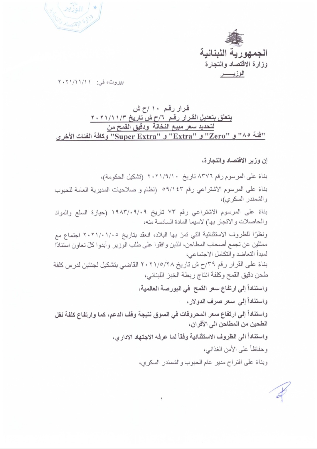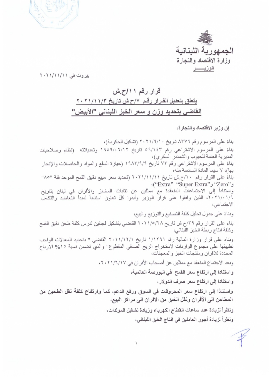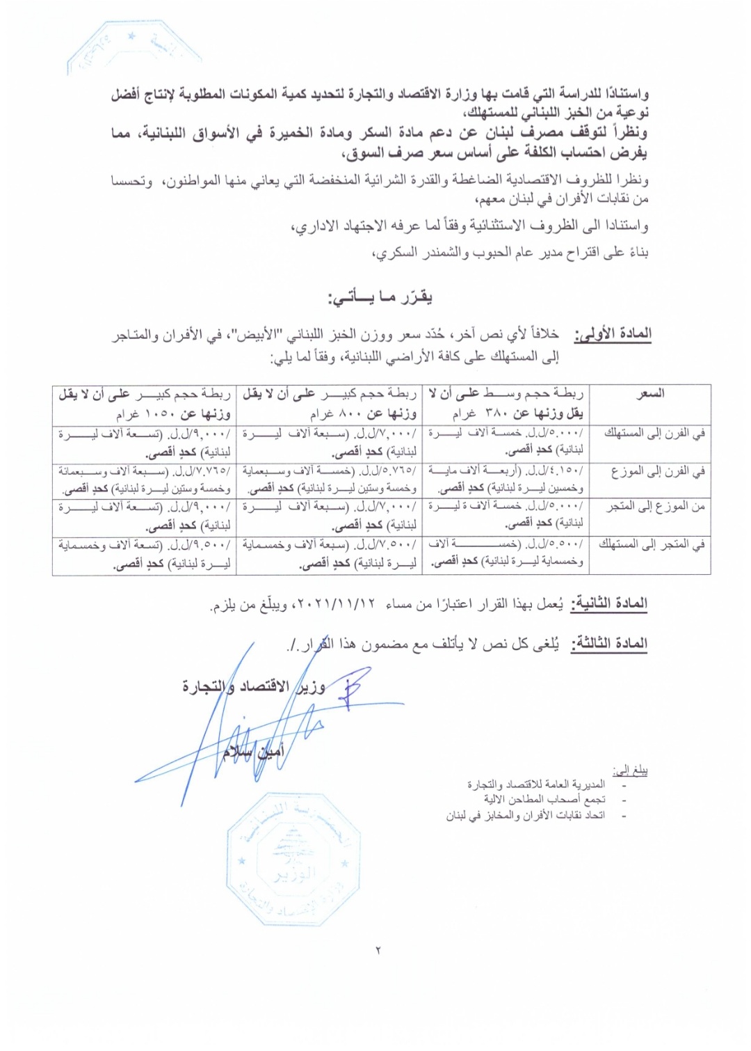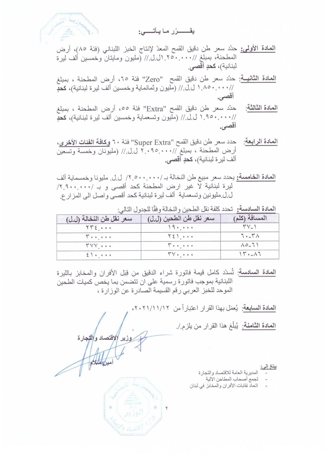 في الموازاة، لفتت إلى أنّ "خلية الأزمة في الوزارة تواصل اجتماعاتها المخصّصة لتدارس الخيارات التي من شأنها أن تحدّ قدر الامكان من تأثير ارتفاع الأسعار على سعر الرغيف"، مشيرةً إلى أنّ "وزير الاقتصاد والتجارة أمين سلام أصدر اليوم قرارين: الأول يتعلّق بتحديد سعر مبيع النخالة ودقيق القمح من "فئة 85" و"zero" و "extra" و"super extra" وكل الفئات الأخرى، والثاني يقضي بتحديد وزن وسعر الخبز اللبناني الأبيض".
