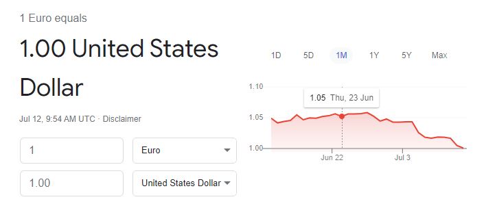 تراجعت قيمة اليورو لتبلغ دولاراً واحداً، في مستوى لم يُسجّل منذ عام طرح العملة الموحدة للتداول قبل عشرين عاماً، وذلك في ظلّ المخاطر الناجمة عن قطع إمدادات الغاز الروسي على الاقتصاد الأوروبي.