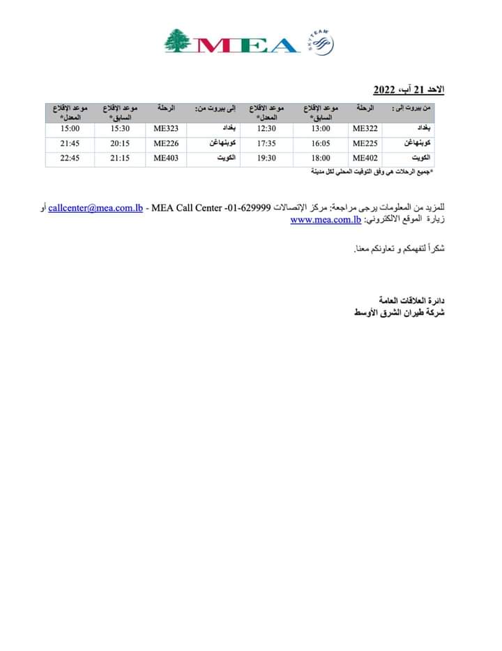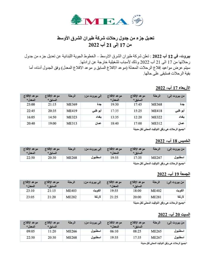 أعلنت شركة طيران الشرق الأوسط عن تعديل جزء من جدول رحلاتها من 17 آب إلى 21 آب 2022 وذلك لأسباب تشغيلية خارجة عن إرادتها.