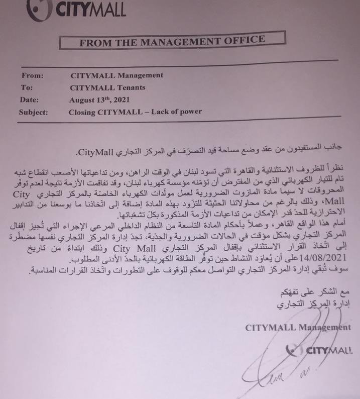 وشرحت أنّه "أمام هذا الواقع القاهر، وعملًا بأحاكم المادّة التّاسعة من النظام الداخلي المرعي الإجراء، الّتي تجيز إقفال المركز التجاري بشكل موقّت في الحالات الضروريّة والجدية، تجد إدارة المركز التجاري نفسها مضطرّة إلى اتخاذ القرار الاستثنائي بإقفال المركز التجاري (سيتي مول)، وذلك ابتداءً من تاريخ 14 آب 2021، على أن يعاود النشاط حين توافر الطاقة الكهربائيّة بالحدّ الأدنى المطلوب".