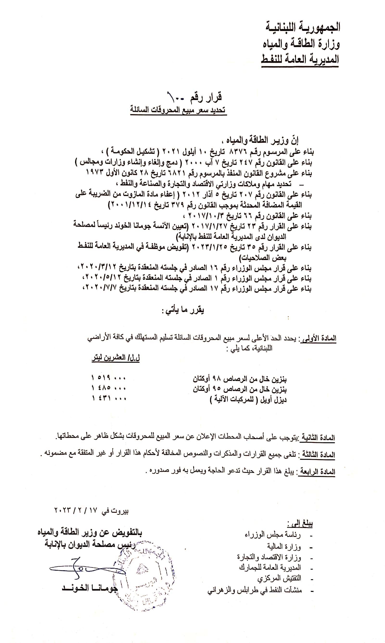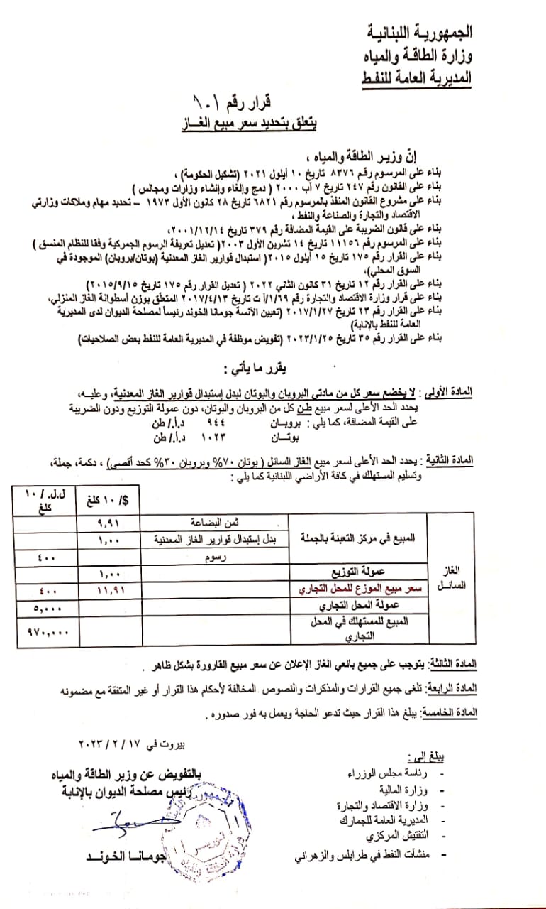 أصدرت مديريّة النفط في وزارة الطاقة جدول أسعار جديد اليوم جاء على الشكل التالي: